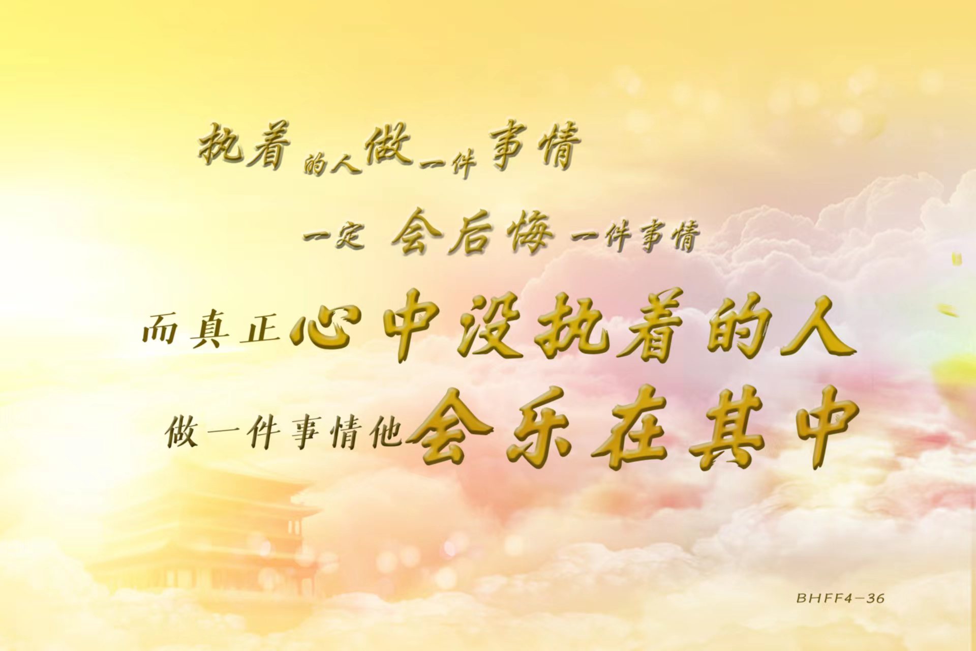 想一想我们过去的痛苦,现在还有人背着,想不通、难过, 很多人临死之前还要舍不得这个、舍不得那个,它怎么能够轻装 待发上西天啊?所以,很多人就是放不下自己的家庭,放不下自 己的房产,放不下自己所有的一切,放下是智慧,执着是痛苦, 学佛人追寻的是智慧,那我们就要学会放下。